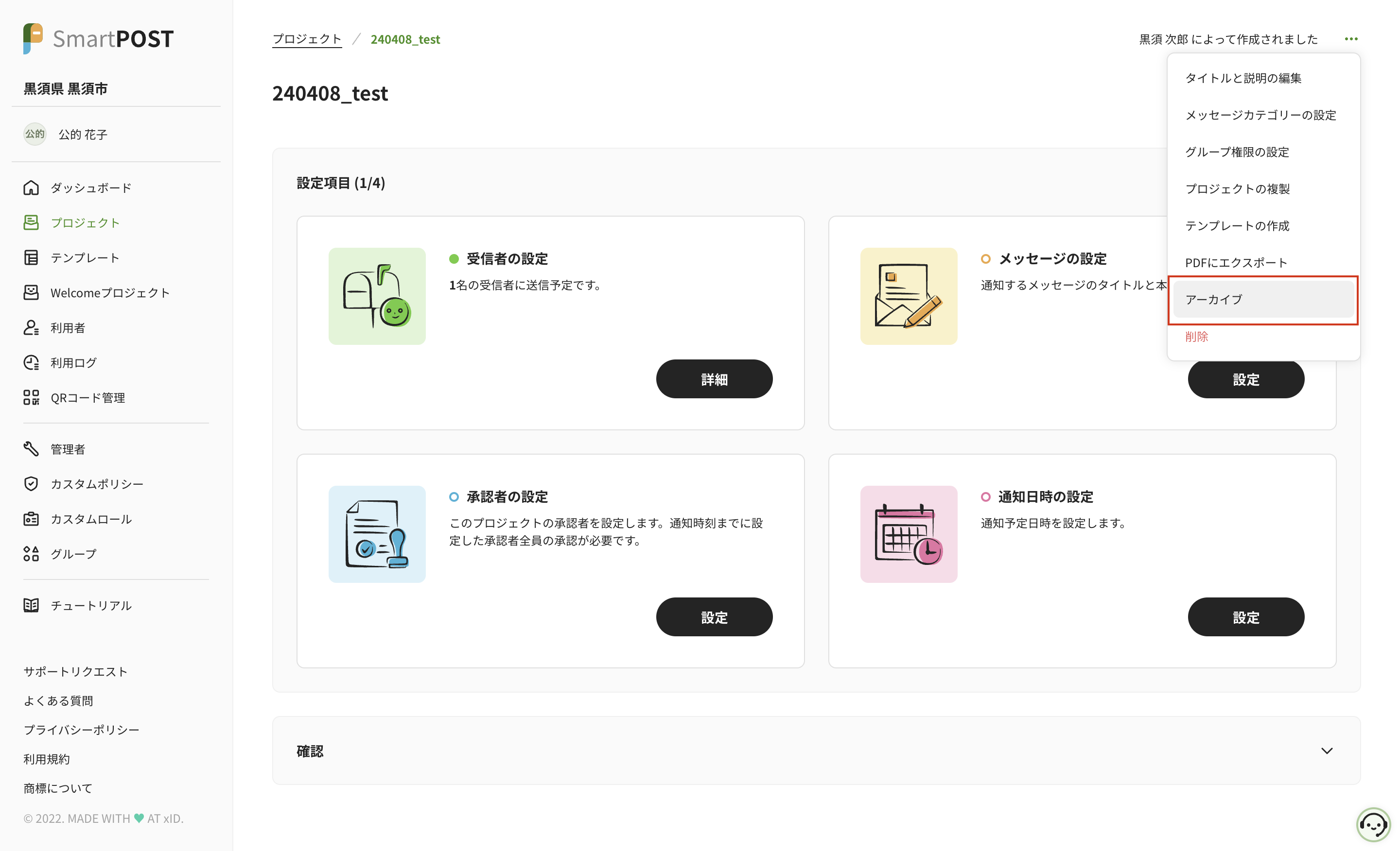 画面右上の三点リーダーアイコンをクリック→ をクリックすると、対象のプロジェクト・テンプレートをアーカイブできます。