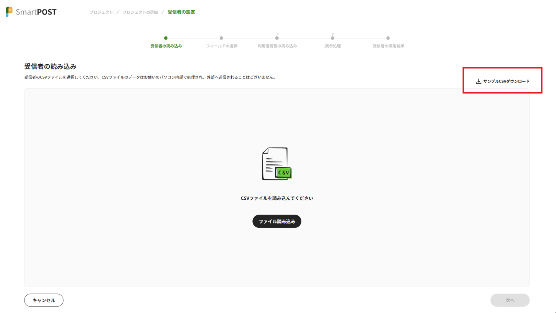 - 「受信者の設定」からサンプルのCSVのダウンロードもできますのでご確認ください。