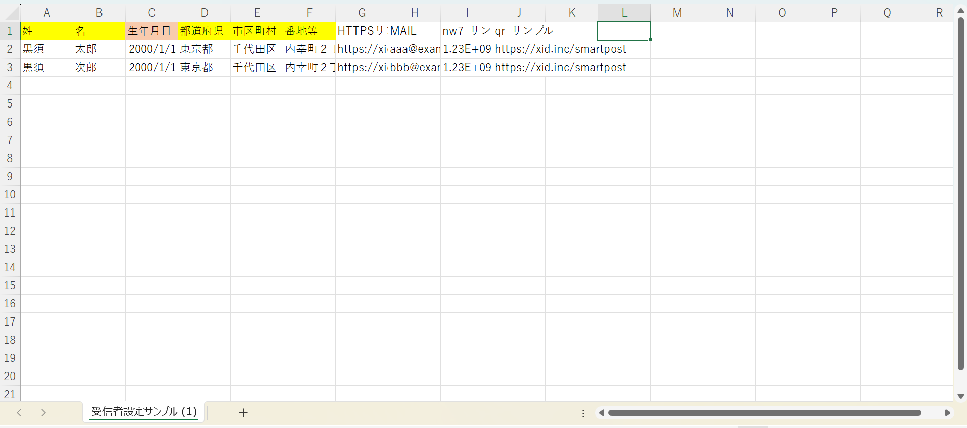 受信者の抽出には以下のデータを含んだCSVファイルが必要です。